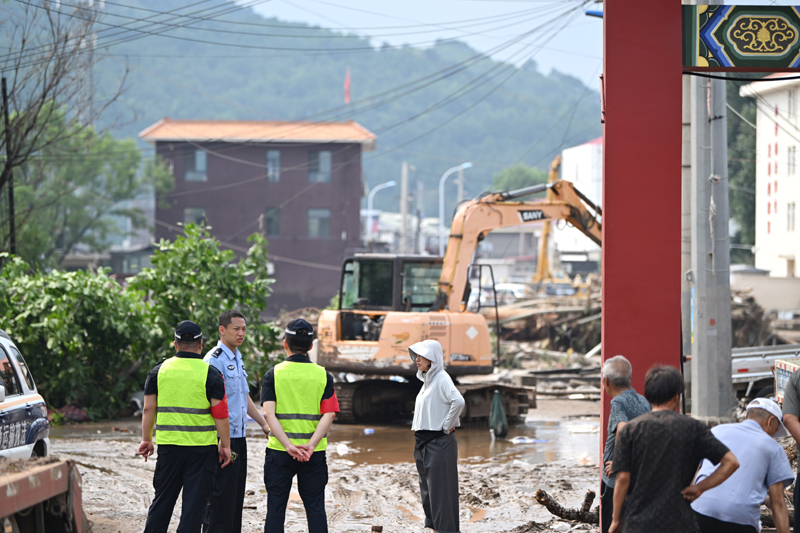 7月28日,防汛抗洪人员在天津市蓟州区下营镇下营村值守。