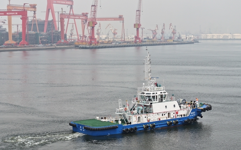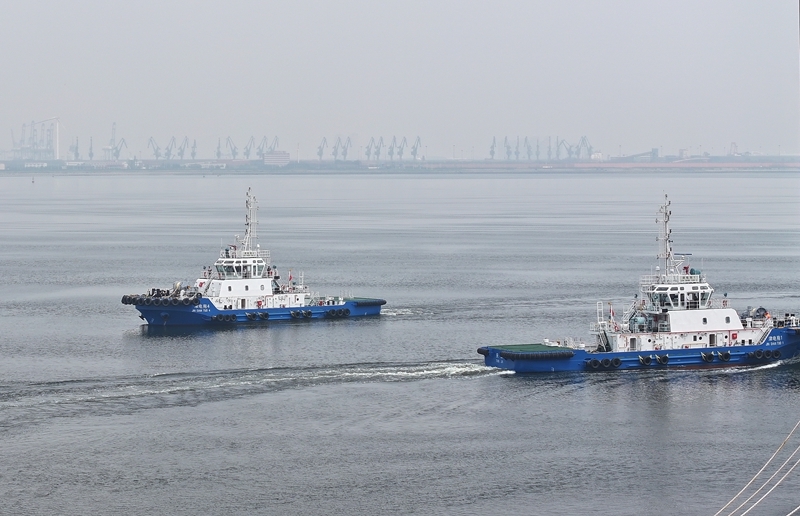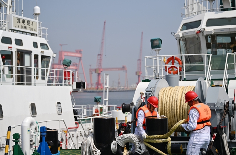 当日,由4艘纯电动港作拖轮组成的“绿色舰队”在中船天津码头鸣笛启航。