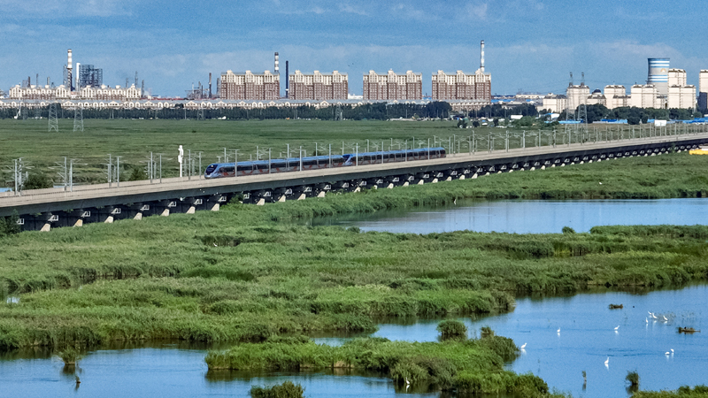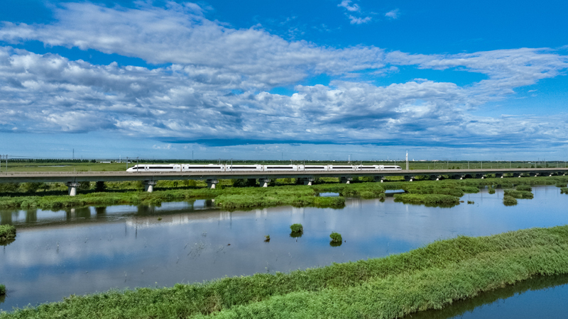 8月17日,复兴号动车组列车行驶在哈齐高铁线上(无人机照片)。